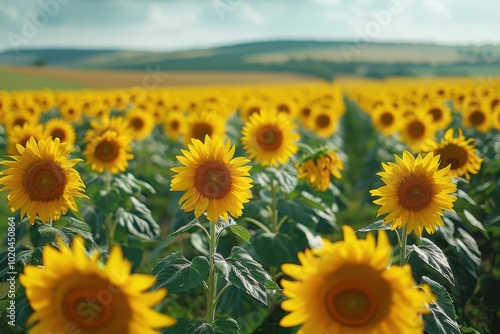 Fototapeta premium Many sunflowers in a field with a sky background, plant background, copy space