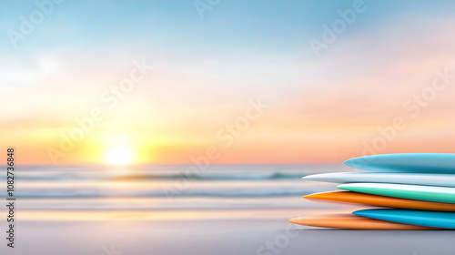 © Ajmeer, Fototapeta premium Many surfboards aligned on the beach with sunset in background