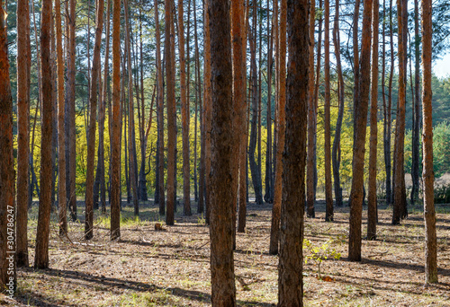 Obraz premium Many tall straight pines in autumn forest in sunny day.