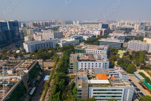 © SNEHIT PHOTO, Fototapeta premium Many technology and apartment buildings in Hitec city with in Hyderabad city a major Information technology hub in India.