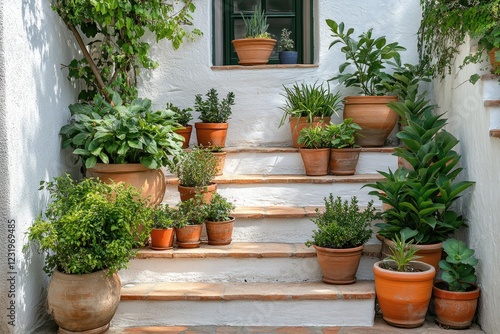 Fototapeta premium Many terracotta pots decorating white stairs in a peaceful mediterranean courtyard