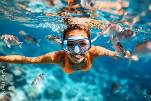Naklejka premium Many tropical fish swim next to her. Bright commercial style image. A lovely and sexy happy middle eastern young woman with blond hair in a swimming mask and fins snorkeling among the corals.