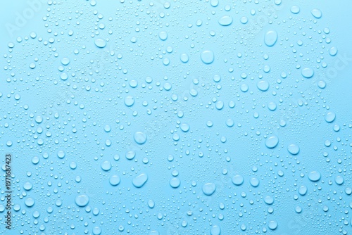 Fototapeta premium Many water drops on light blue background, top view
