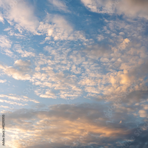 Naklejka premium many wind-scattered cirrus clouds beautifully illuminated by the setting sun