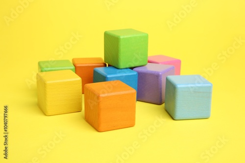 Obraz premium Many wooden colorful cubes on yellow background