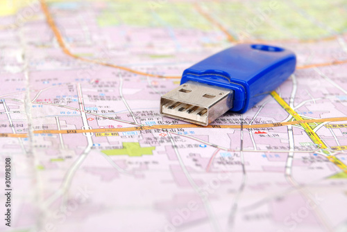 © Xuejun Li, Fototapeta premium Map and USB flash disk