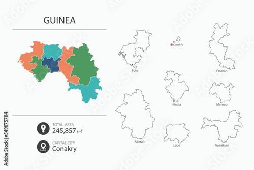 Naklejka premium Map of Guinea with detailed country map. Map elements of cities, total areas and capital.