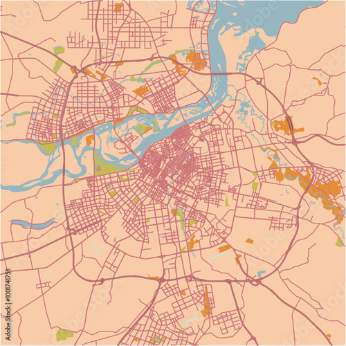 Fototapeta premium Map of Harbin in China in a sandy theme. Contains layered vector with roads water, parks, etc.