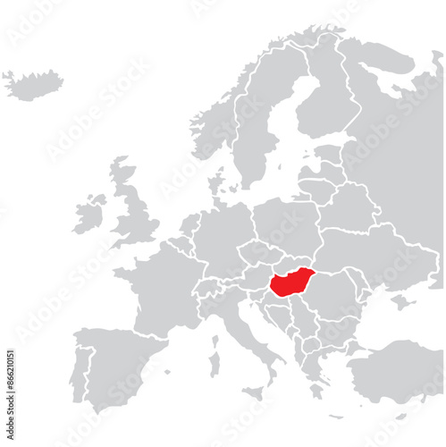 © Creative Milos, Obraz premium Map of Hungary highligted with red in Europe map.