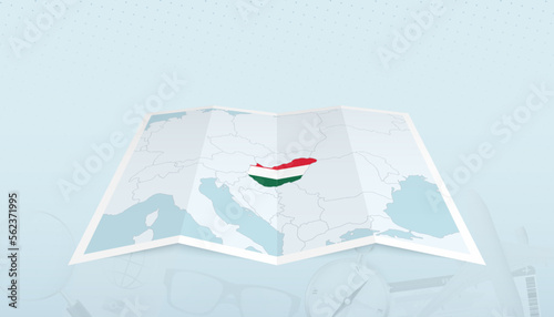 Obraz premium Map of Hungary with the flag of Hungary in the contour of the map on a trip...