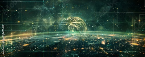 © annamaria, Fototapeta premium Map of modern technology connection on Earth, panorama banner. Generative AI.