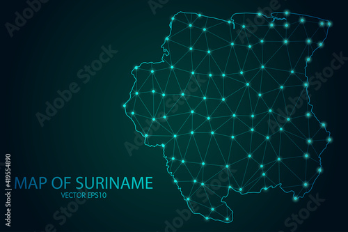 Fototapeta premium Map of Suriname - With glowing point and lines scales on The dark gradient background, 3D mesh polygonal network connections. Vector illustration eps10.