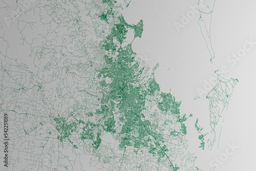 Obraz premium Map of the streets of Brisbane (Australia) made with green lines on white paper. 3d render, illustration