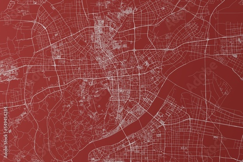 © Hairem, Fototapeta premium Map of the streets of Hangzhou (China) made with white lines on red background. Top view. 3d render, illustration