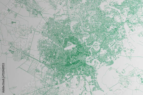 Fototapeta premium Map of the streets of Ho Chi Minh (Vietnam) made with green lines on white paper. 3d render, illustration