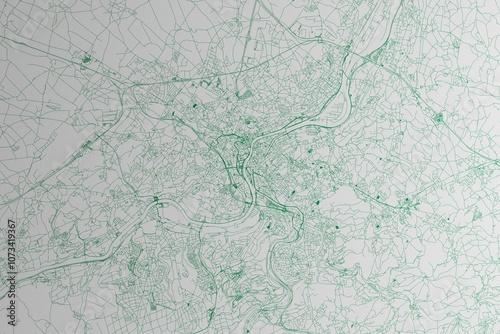 Fototapeta premium Map of the streets of Liege (Belgium) made with green lines on white paper. 3d render, illustration