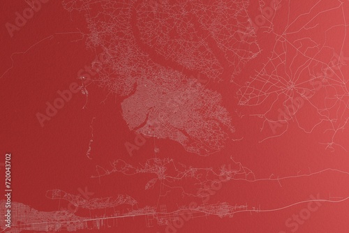 Obraz premium Map of the streets of Porto Novo (Benin) made with white lines on red paper. Top view, rough background. 3d render, illustration