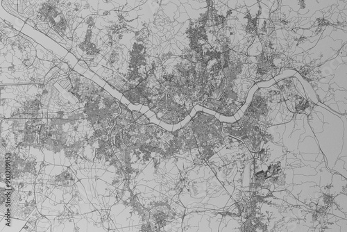 © Hairem, Naklejka premium Map of the streets of Seoul (South Korea) made with black lines on grey paper. Top view. 3d render, illustration