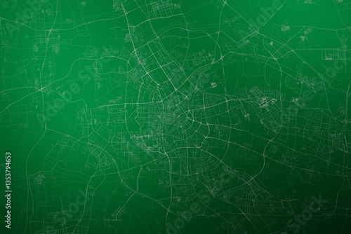© Hairem, Fototapeta premium Map of the streets of Tianjin (China) made with white lines on abstract green background lit by two lights. Top view. 3d render, illustration