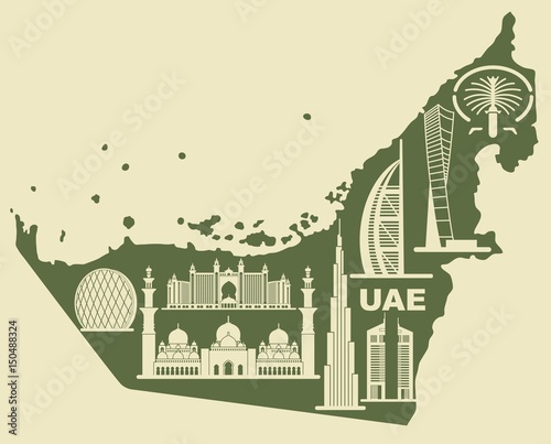 Fototapeta premium Map of the UAE with silhouettes of buildings