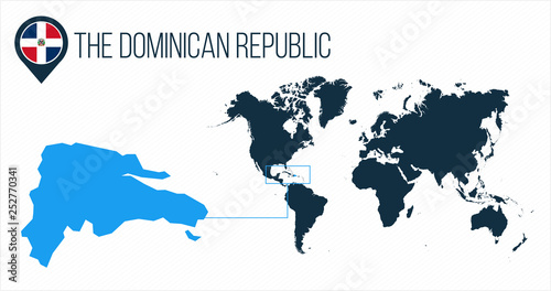 © CarryLove, Fototapeta premium Mapa Dominikany znajduje się na mapie świata z flagą i wskaźnikiem mapy lub pinezką. Mapa plansza. Ilustracja wektorowa na białym tle.