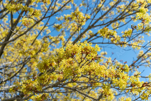 Naklejka premium maple leaf inflorescences or flower clusters on a blue sky in spring