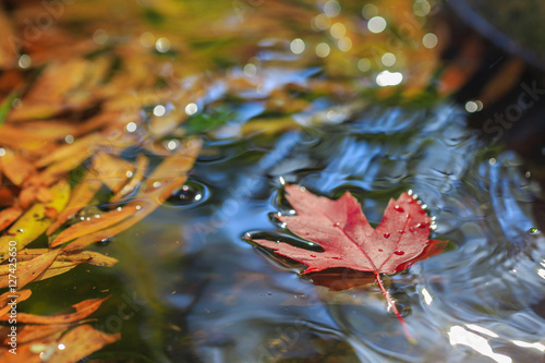 © muratani, Fototapeta premium Maple leaf on water with other leaves.