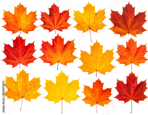 © AivaVisions, Obraz premium Maple leaves arranged in rows on white background.