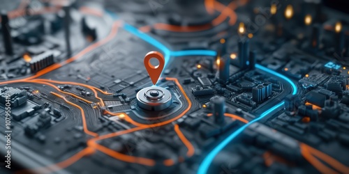 Fototapeta premium Mapping digital locations with ai technology hand set coordinates on map with two pins in urban environment perspective