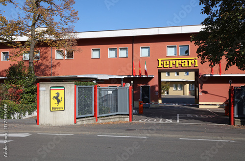 © Katherine Welles, Obraz premium Maranello, Modena, Italy - Oct 17, 2025: The Ferrari headquarters in Maranello. Ferrari is a luxury sports car manufacturer and F1 racing company.