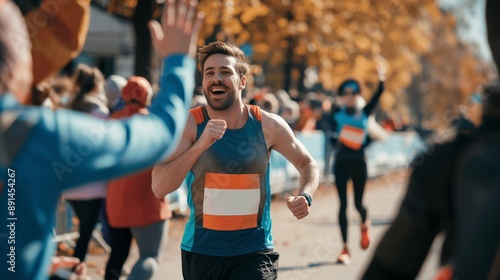 © Daniel, Fototapeta premium Marathon Audience Supporting and Cheering Their Loved Ones Participating in the Race: Athletic Male Marathon Runner Giving a High Five