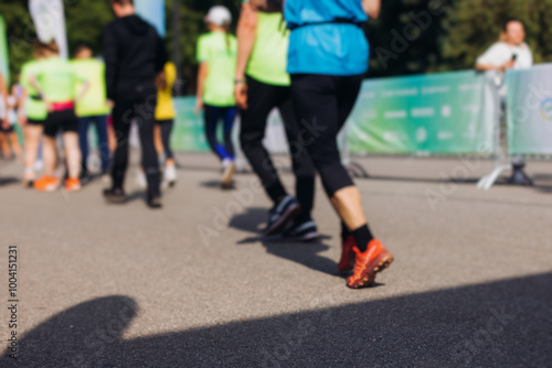 © tsuguliev, Fototapeta premium Marathon runners crowd, sportsmen participants start running the half-marathon in the city streets, crowd of sportswomen joggers in motion, group athletes outdoor training competition in a summer day
