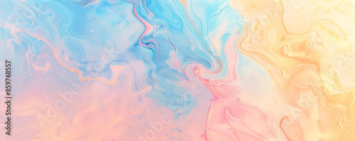 Fototapeta premium Marble abstract background featuring soft pastel tones of blue, pink, and yellow. The subtle, fluid patterns create a calm and relaxing atmosphere