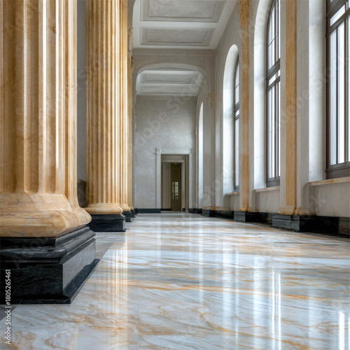 Fototapeta premium Marble floor grand column arched window public building elegant hallway natural light classic architecture interior