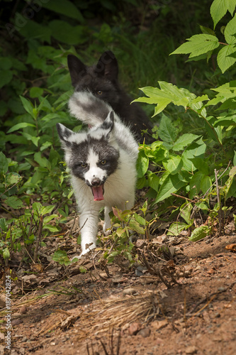© geoffkuchera, Fototapeta premium Marble Fox and Silver Fox (Vulpes vulpes) Trot Around Corner