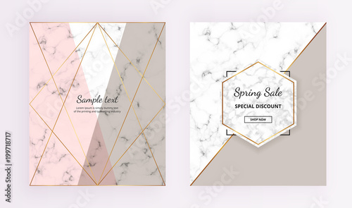 Fototapeta premium Marble geometric cover designs. Pink, grey, gold lines background. Trendy...