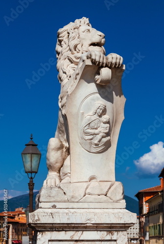 Fototapeta premium Marble lion statue with old streetlamp, erected in 1875 in Pisa historical...