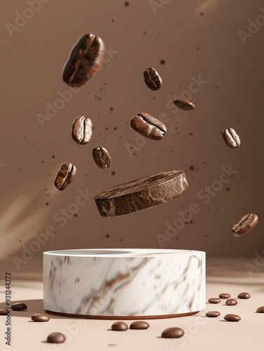 Fototapeta premium marble round podium for product demonstration, coffee beans flying around,...