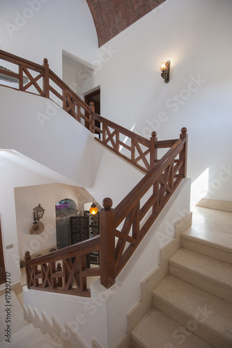 Obraz premium Marble staircase in luxury villa home with wooden bannister
