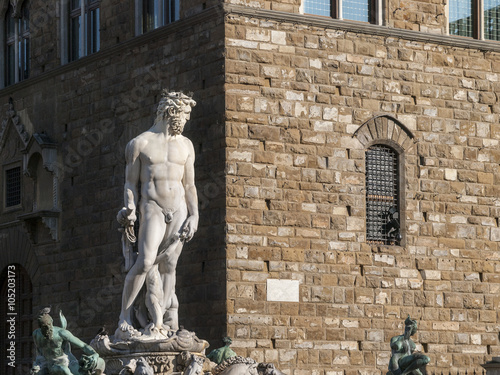 Naklejka premium Marble Statue of Neptune in Florence: A brighly lit statue of the god Neptune in the famous Piazza della Signoria in Florence