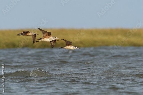 © Wilfred, Fototapeta premium Marbled godwit (Limosa fedoa) small flock flying by, Bolivar Peninsula, Texas, USA