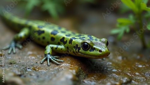 Naklejka premium Marbled newt resting on wet stone camouflaged skin blends into moss covered...