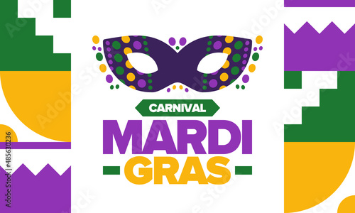 Fototapeta premium Mardi Gras Carnival in New Orleans. Fat Tuesday. Traditional folk festival with parade and celebration. Annual holiday. Costume masquerade, fun party. Carnival mask. Poster, card, banner. Vector