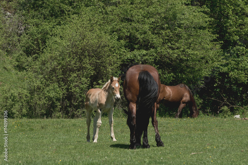 © Aurelian Nedelcu, Fototapeta premium Mare and cute foal in summer pasture