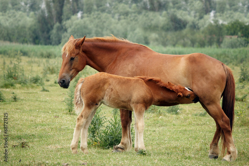 © goce risteski, Fototapeta premium mare and foal breastfeeding in the field