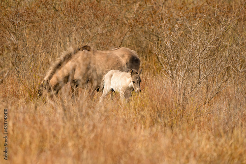 © Dasya - Dasya, Fototapeta premium Mare and foal konik horse graze in the golden reeds