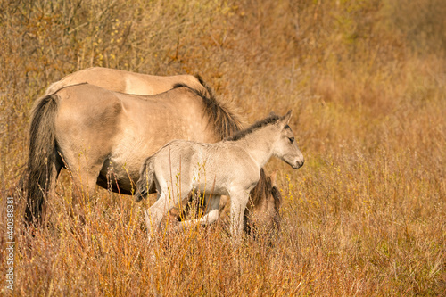 © Dasya - Dasya, Naklejka premium Mare and foal konik horse graze in the golden reeds