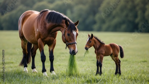 © NeuralNiche, Fototapeta premium Mare and her foal grazing together in a lush green field, showcasing the bond between mother and young horse in a serene outdoor setting.