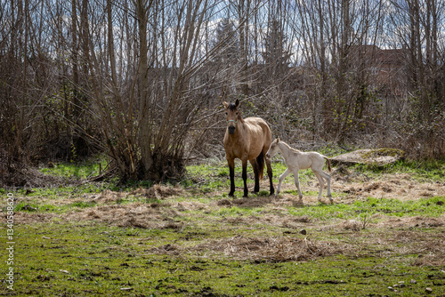 Fototapeta premium Mare with her young foal in a meadow next to the trees. Horses. León, Spain.