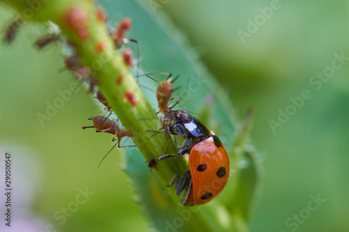 © Roy, Obraz premium Marienkäfer frisst lause auf einem Blütenstamm